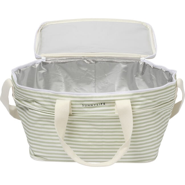 LIGHT COOLER: BAG - LA PALMA SAGE STRIPE - Keep your food and drinks at the perfect temperature with the SUNNYLiFE Light Cooler Bag. Whether you're heading to a picnic, beach day, or outdoor adventure, this stylish bag offers convenient and functional insulation, keeping your meals hot or cold for up to 3 hours. The food-safe insulated interior is designed to protect your items, while the cotton webbing handles and adjustable shoulder strap provide comfortable and easy transport. Collapsible for easy storage, this cooler bag combines lightweight durability with a chic, coastal-inspired design. OVERVIEW: Capacity 18.7L/4.9 Gallon. Cotton webbing handles & shoulder strap. Insulates meals hot or cold for up to 3 hours. Food safe insulated interior. Lightweight and durable. Collapsible. SIZE: 13.4 x 9.8 x 8.7 inch. Weight: 0.66lbs. LA PALMA: Color & print palette - Inspired by coastal living, relaxed and casual with a sun-bleached pallet of sage green and creamy hues adding a cool accent to neutrals. Reflective of sandy shores, the ocean, and its surroundings, this is a collection perfect for the modern sun seeker: uncomplicated, understated and under the sun.