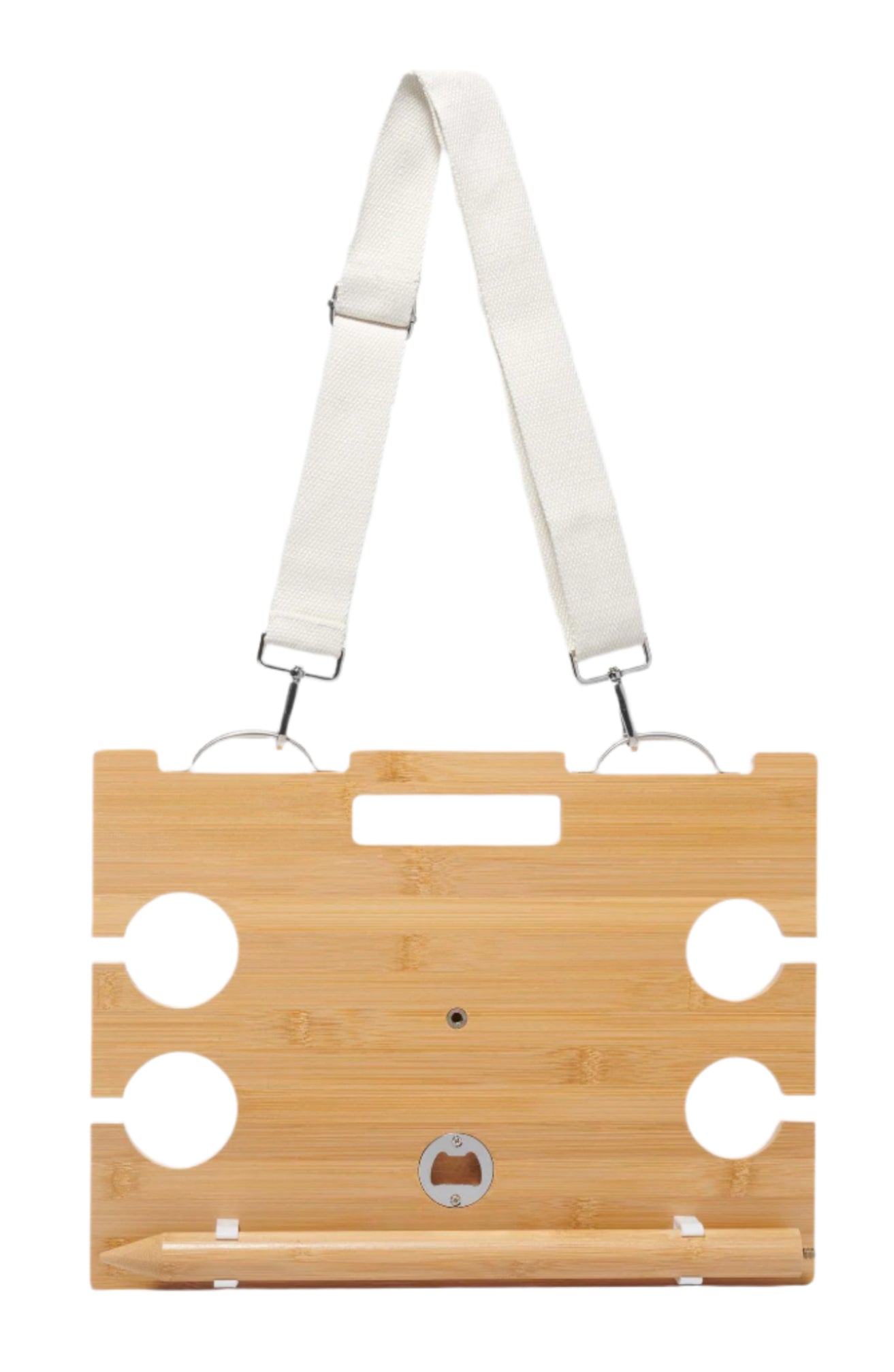 - This Sand Table is chic and functional, perfect for serving charcuterie and drinks on the go. Made from light Bamboo wood with space for nibbles, 4 wine glasses and features a built-in bottle opener, everything you could need for a quick drink and bite to eat. Simply push the table into compact sand or soft grass and enjoy. Soak up your surroundings in style with its modern look and neutral colorway that will have you whisked away to island paradise.