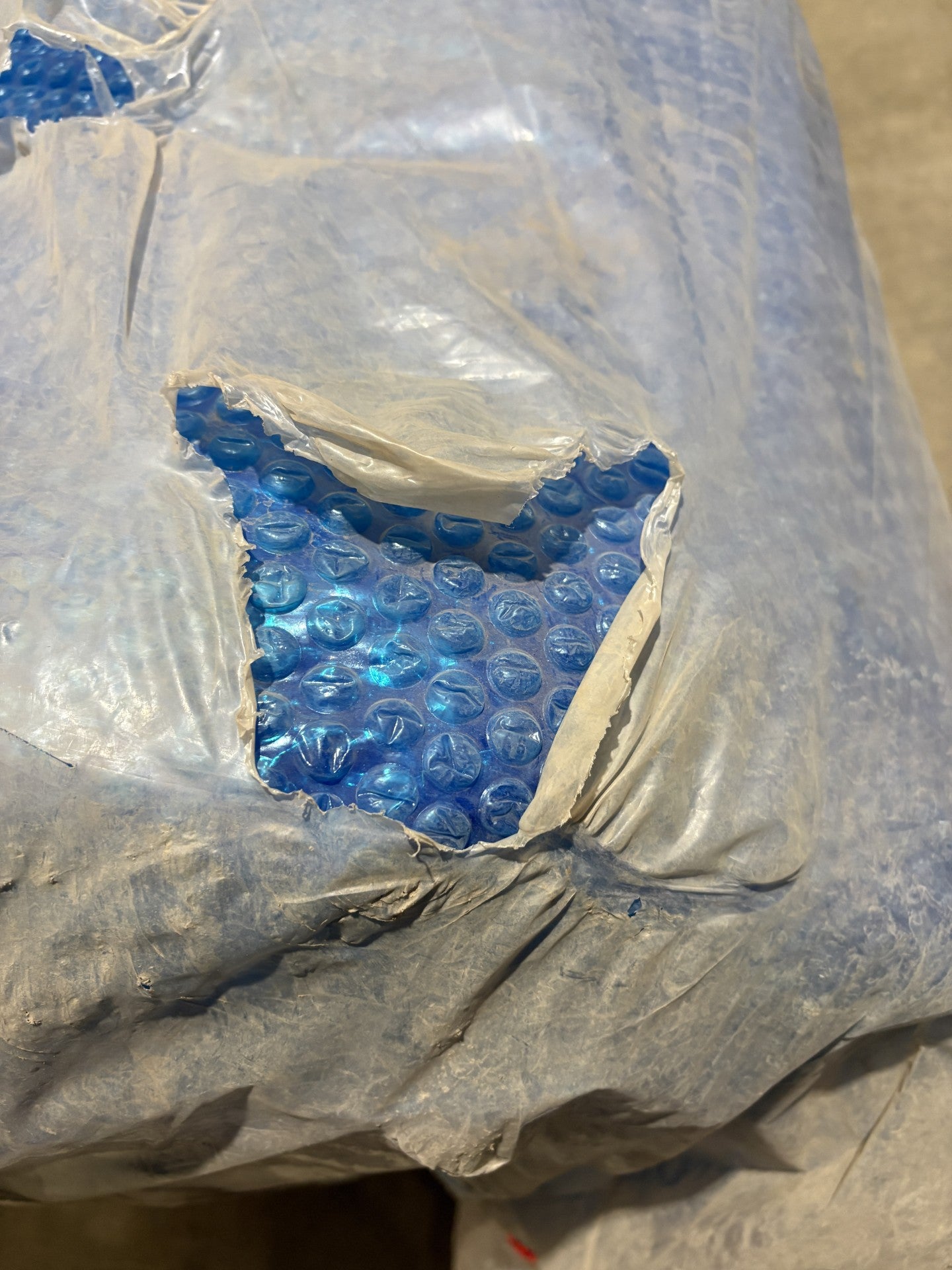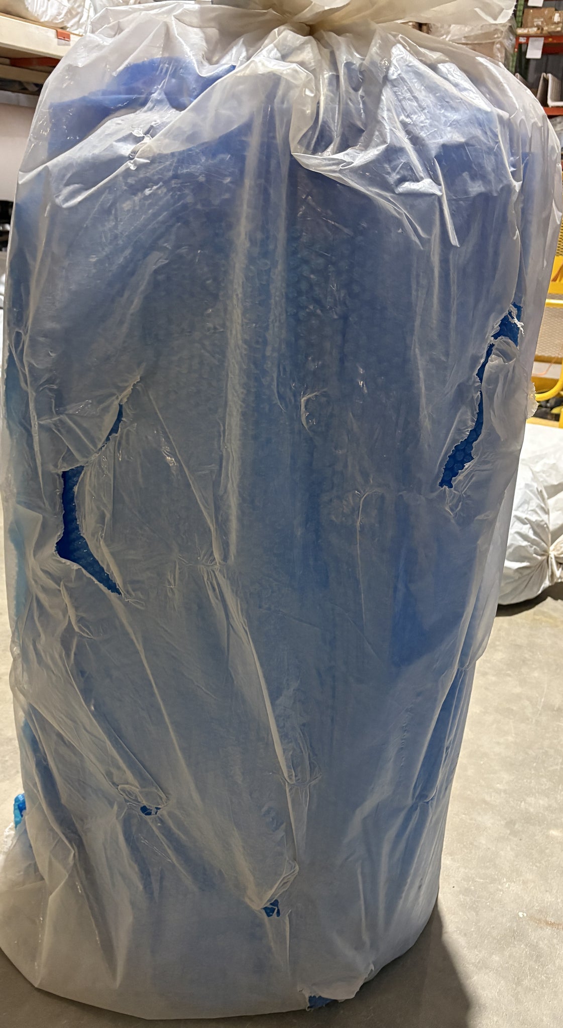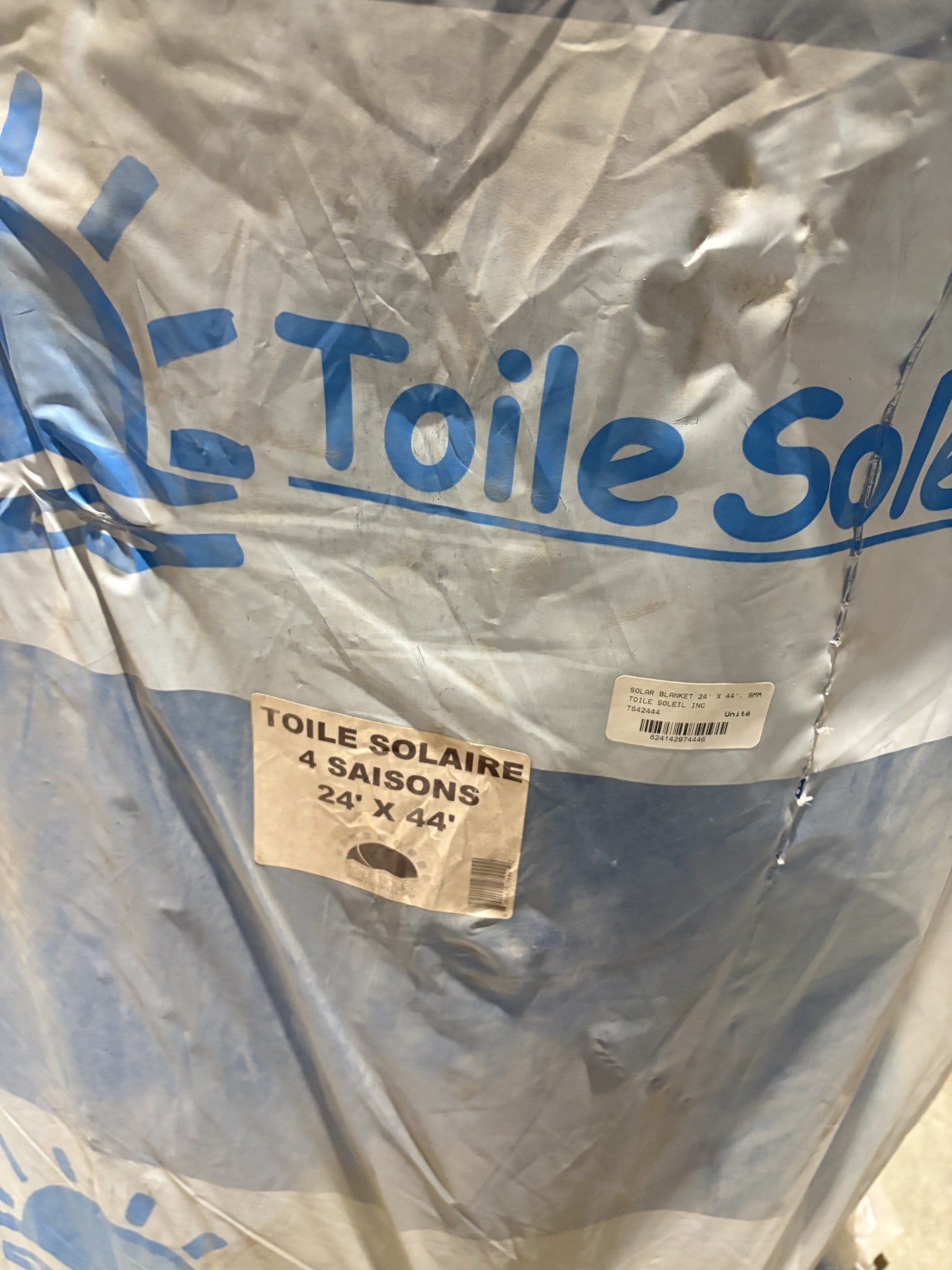 This is a 24X44', 9mm solar blanket. It's packaging is in rough condition, it's ripped open on the bottom and dirty. The blanket itself is also dirty. No visible popped bubbles.