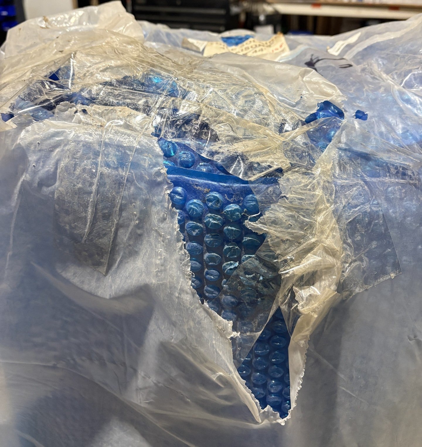 This is a 20x44', 9mm solar blanket. It's packaging is in rough condition, ripped and a little dirty. The blanket itself is torn through at least two layers, there would be some popped bubbles near the ripped area.