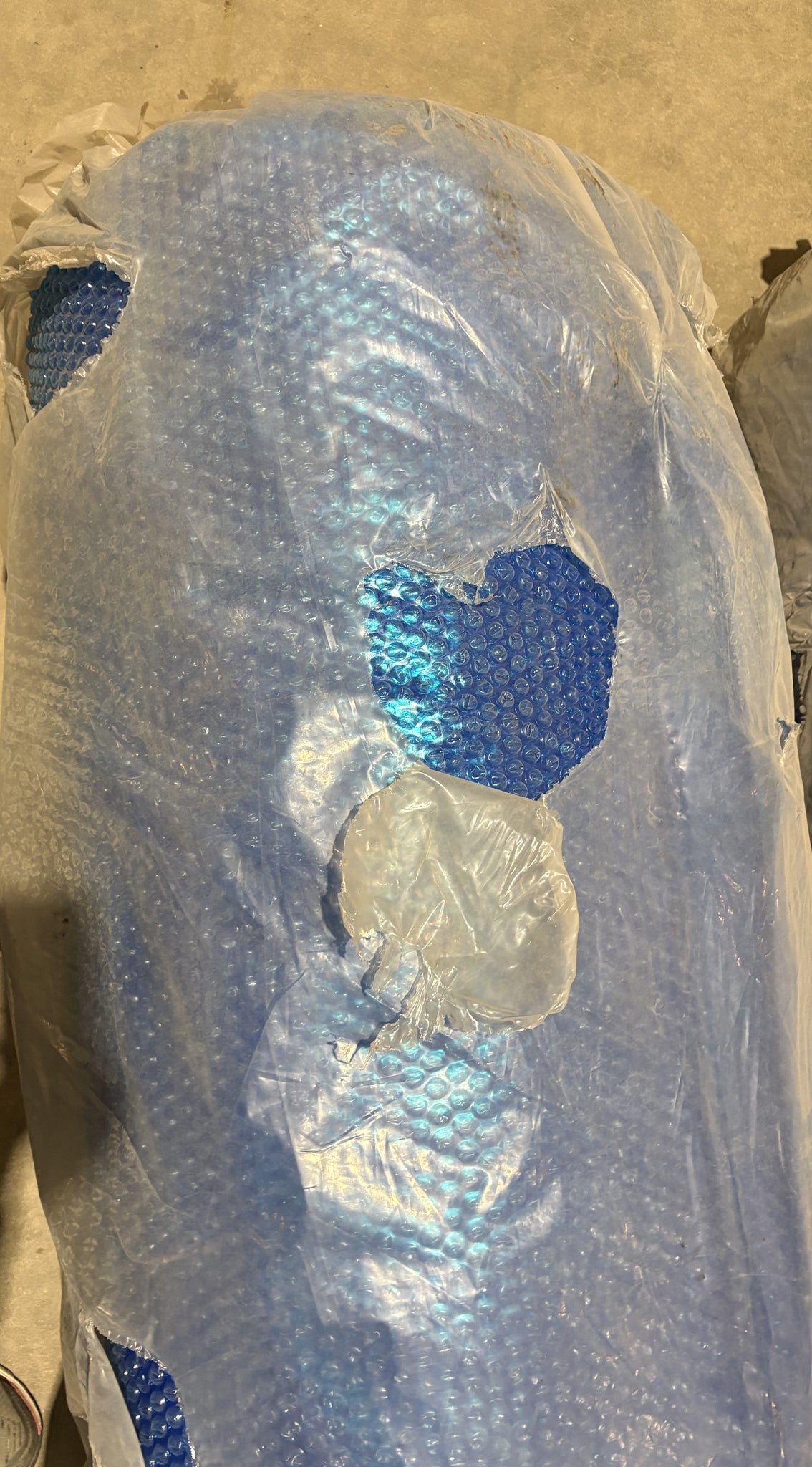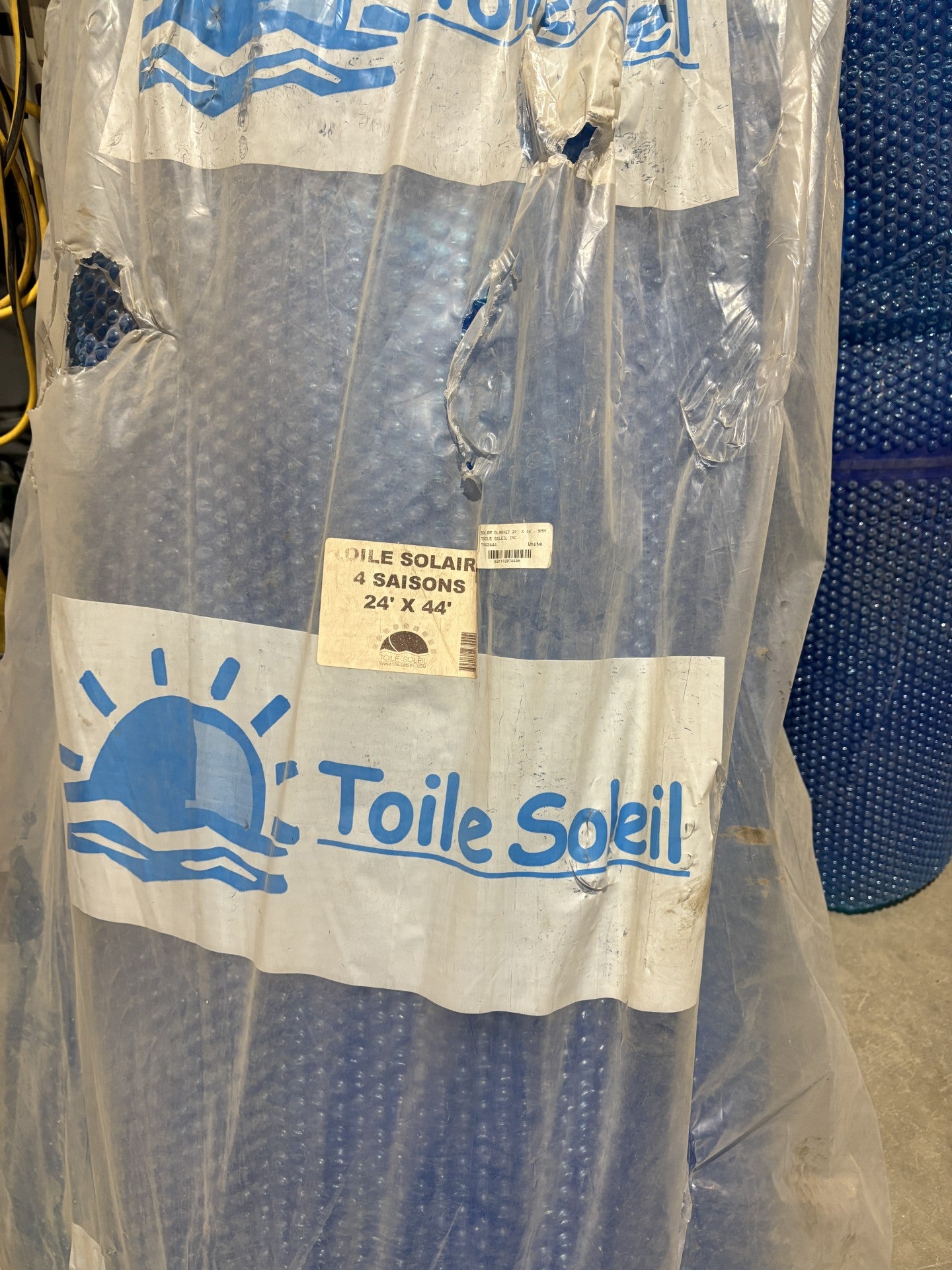 This is a 24X44', 9mm solar blanket. It's packaging is in rough condition, it's ripped open on the bottom and dirty. The blanket itself is also dirty. No visible popped bubbles.