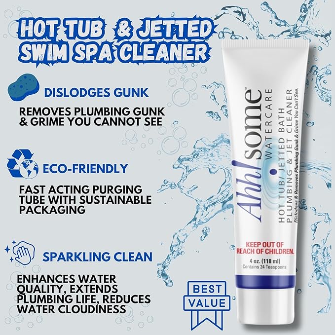 • SMALL CONTAINER, BIGGER RESULTS: Ahh-Some is Hot Tub industry's most recommended bio-cleaning product to mitigate water chemistry and maintenance issues. The small container is packed with incredible cleaning capacity that removes scale, slime, & other bio-contaminants that typically build up within the plumbing infrastructure. The container has enough gel to purge a 400-gallon hot tub 4 times & an indoor jetted tub 24 times. Compared to liquid cleaners, you'll find this of much greater value.